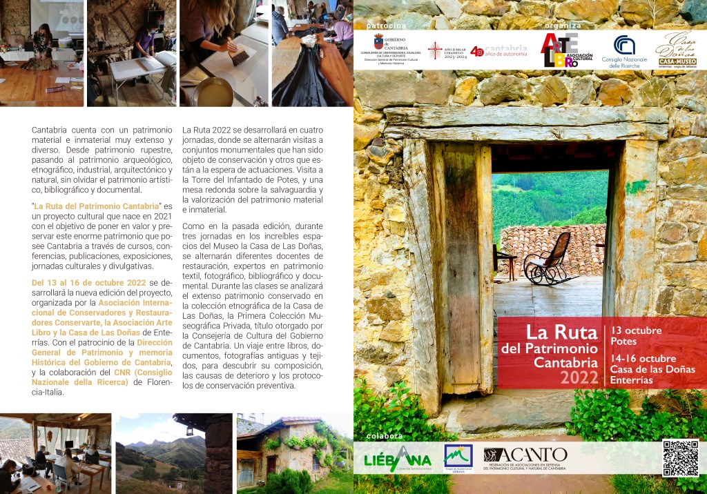 Del 13 al 16 de octubre 2022 se desarrollará la nueva edición de “La Ruta del Patrimonio Cantabria”, organizada por la Asociación Internacional de Conservadores y Restauradores Conservarte, la Asociación Arte Libro, la Casa de Las Doñas de Enterrías, con el patrocinio de la Dirección General de Patrimonio y memoria histórica del Gobierno de Cantabria, y la colaboración del CNR (Consiglio Nazionale della Ricerca) de Florencia Italia.