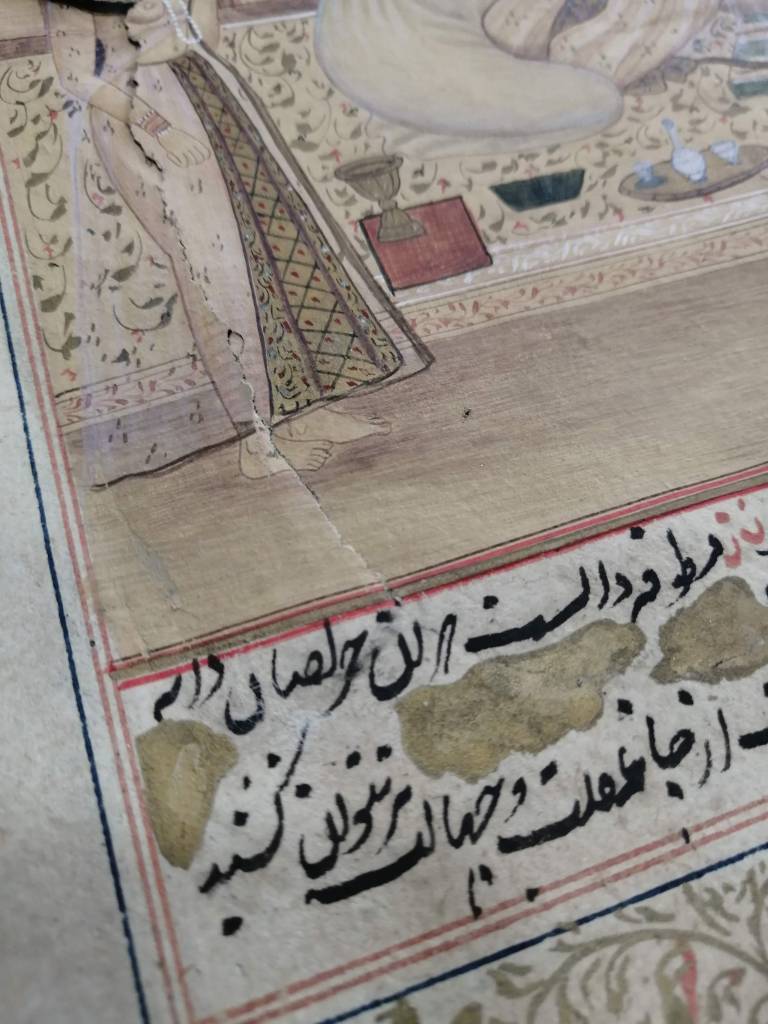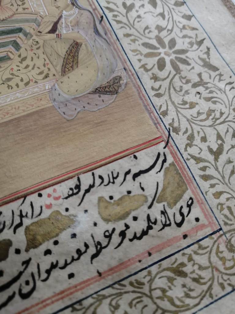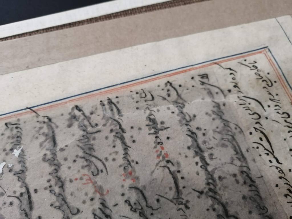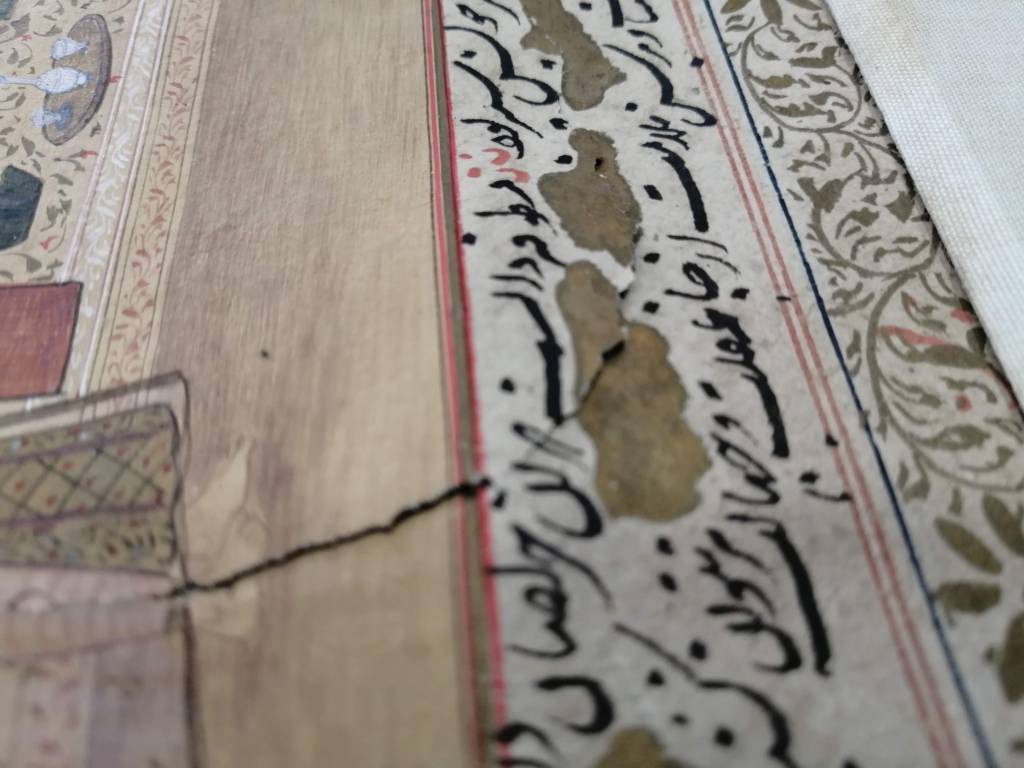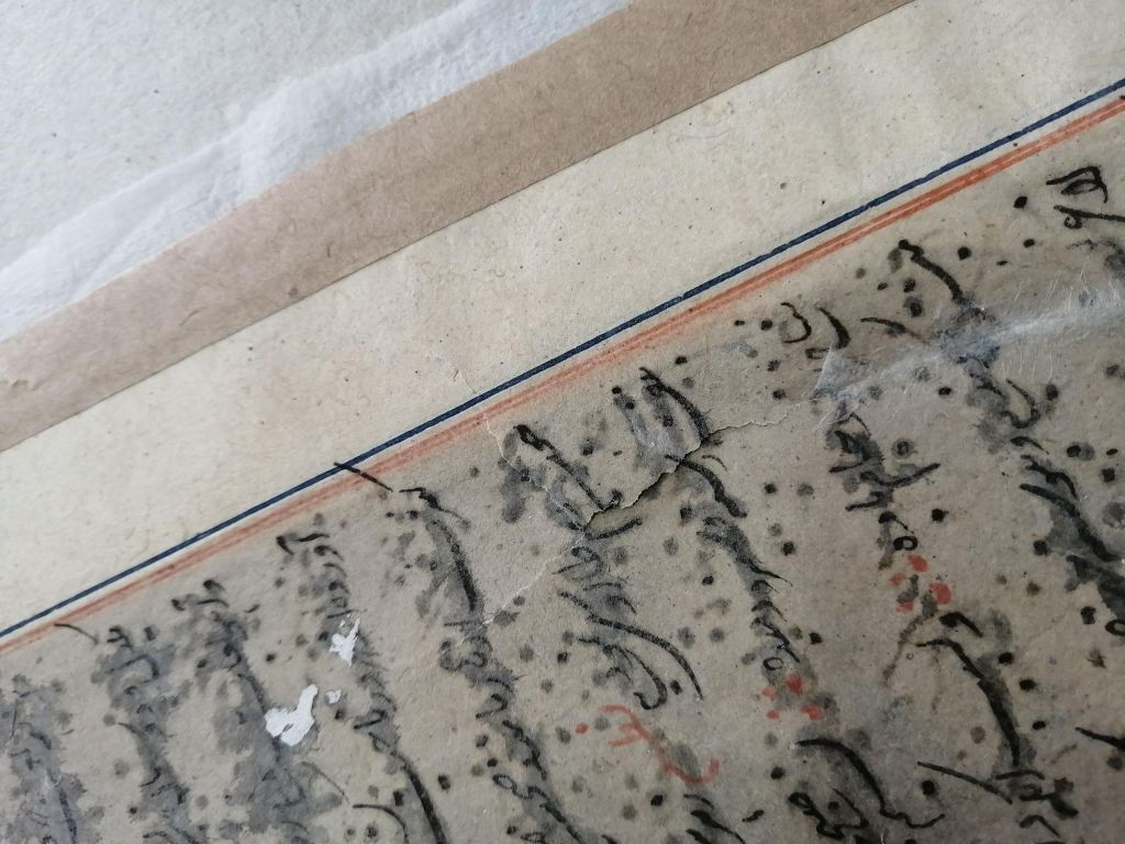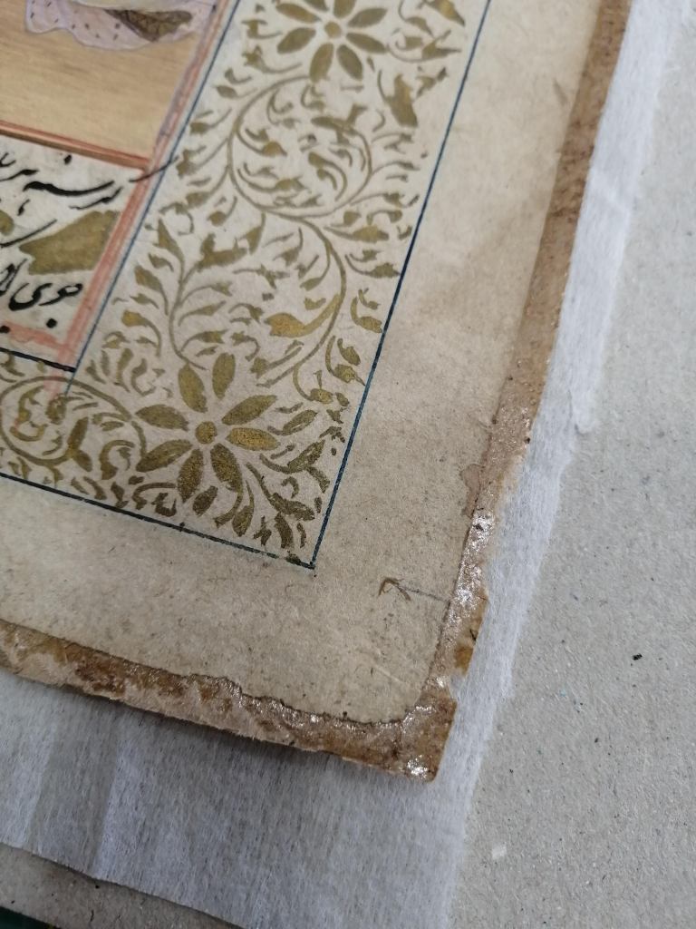 Conservation work of an illuminated page of an Islamic manuscript.