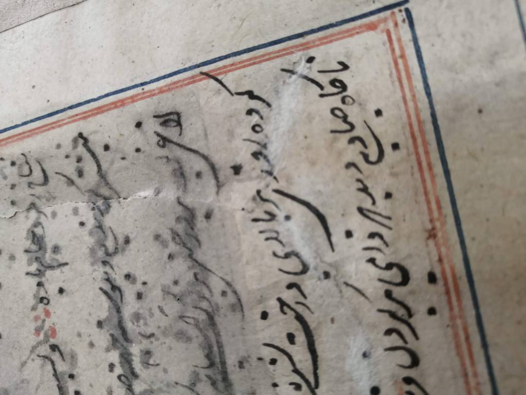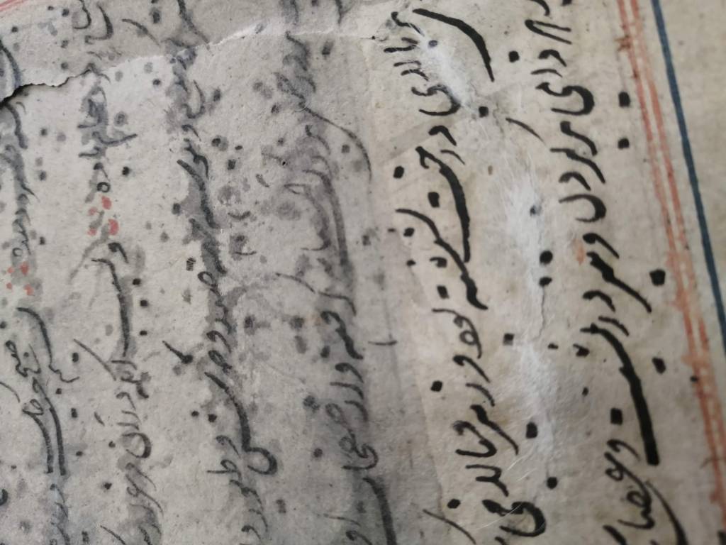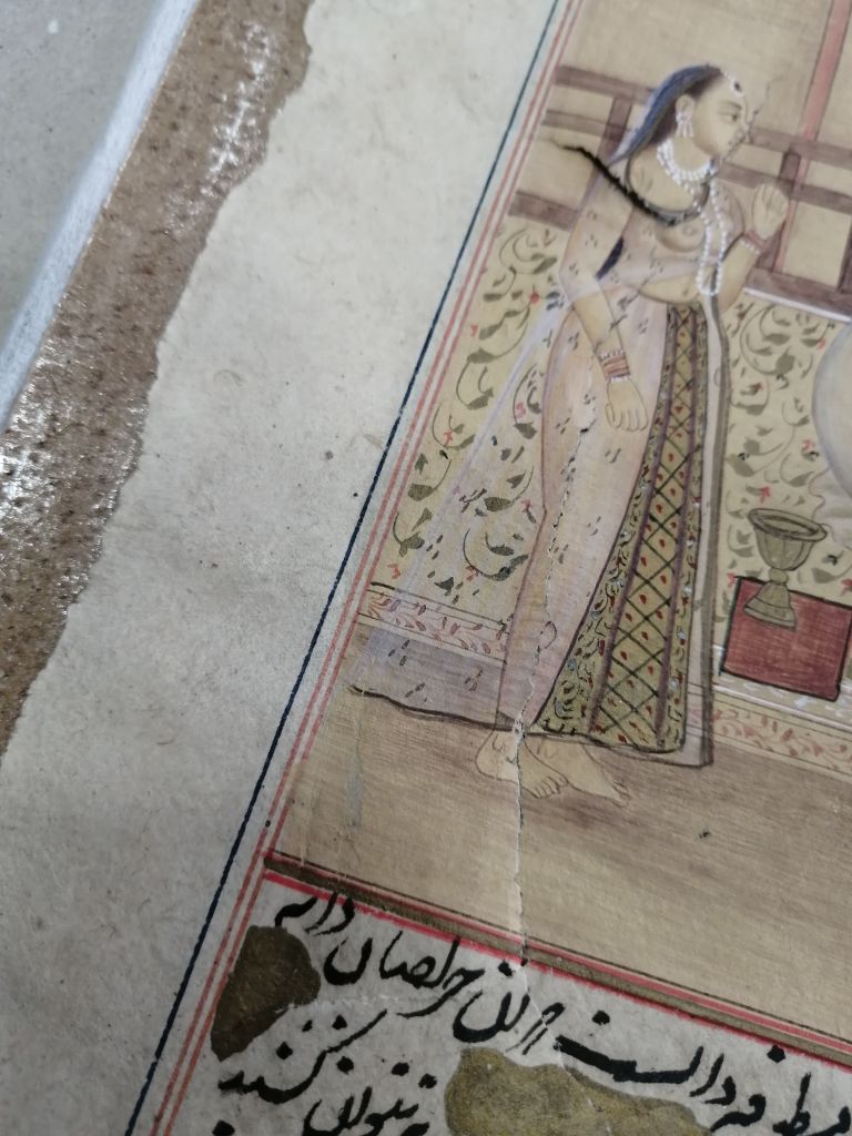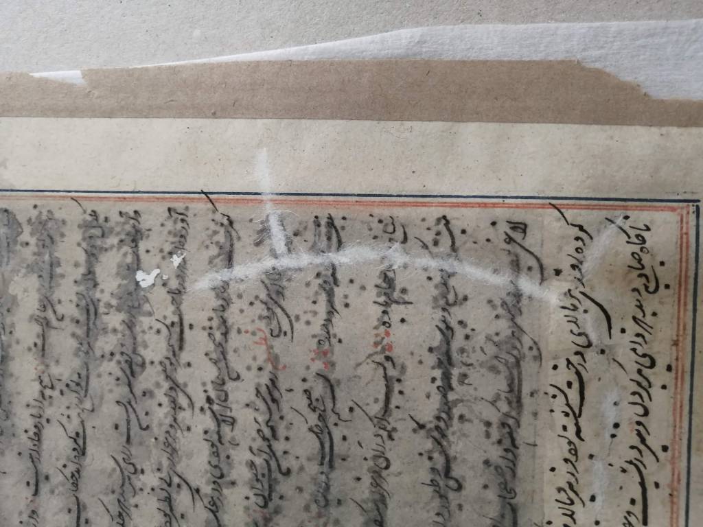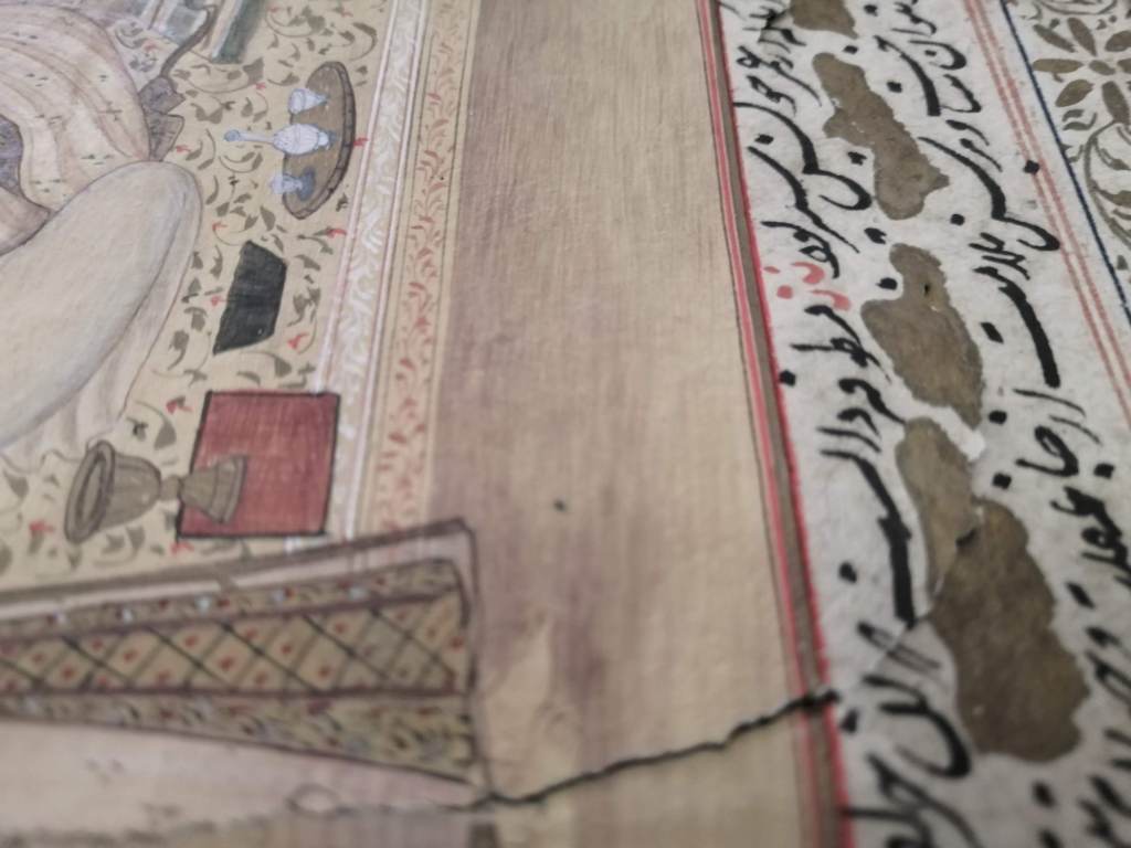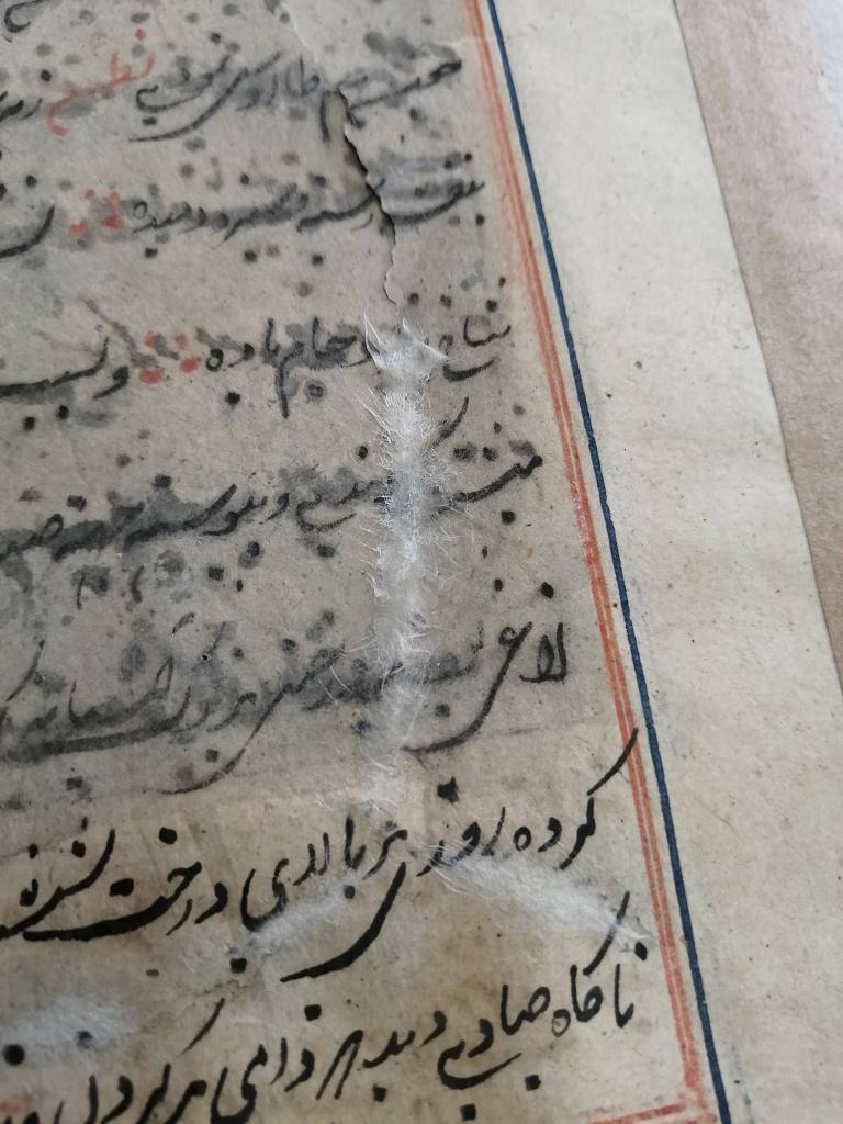Conservation operations: After superficial cleaning with a soft goat hair brush, the tear was restored using Japanese paper fiber bridges, on the back of the page, using Klucel G in hydroalcoholic solution. Next, the page was flattened, interleaved with non-woven fabric, using controlled weights under a layer of felt.