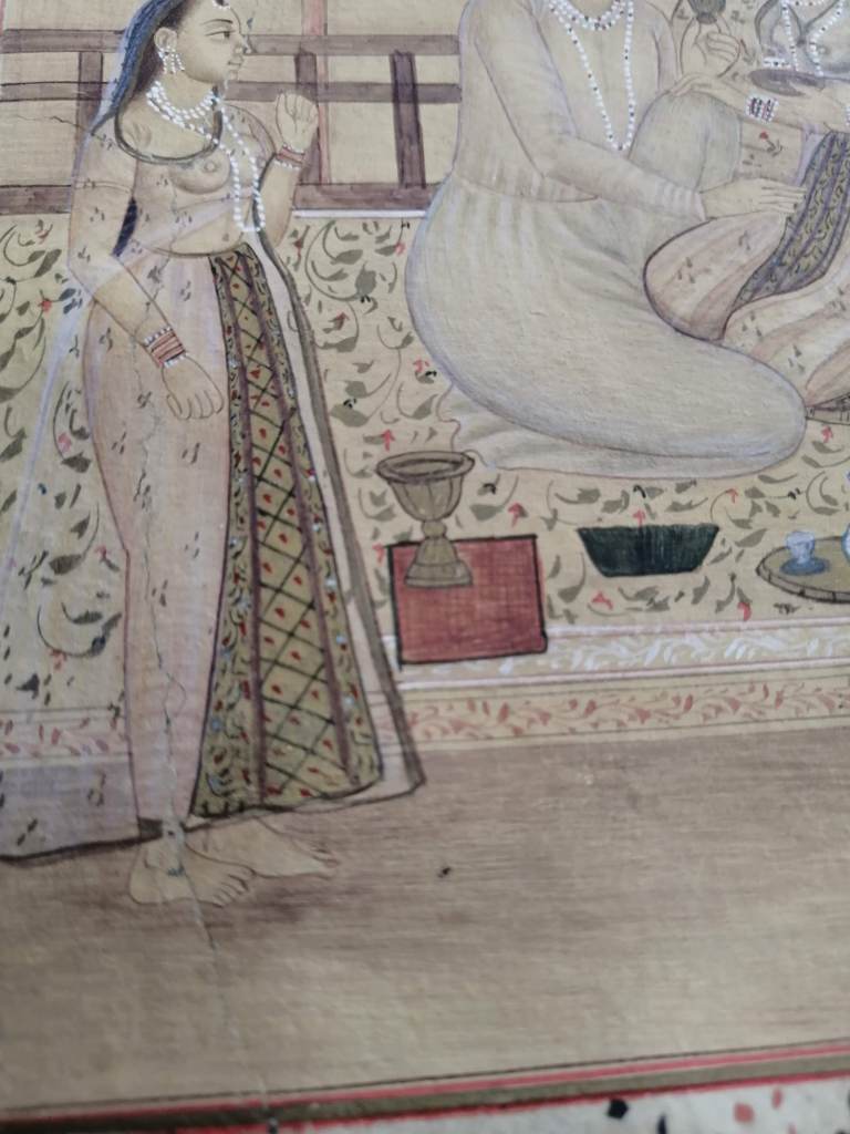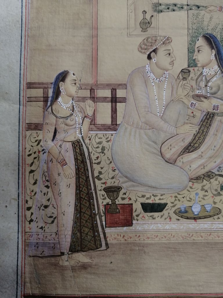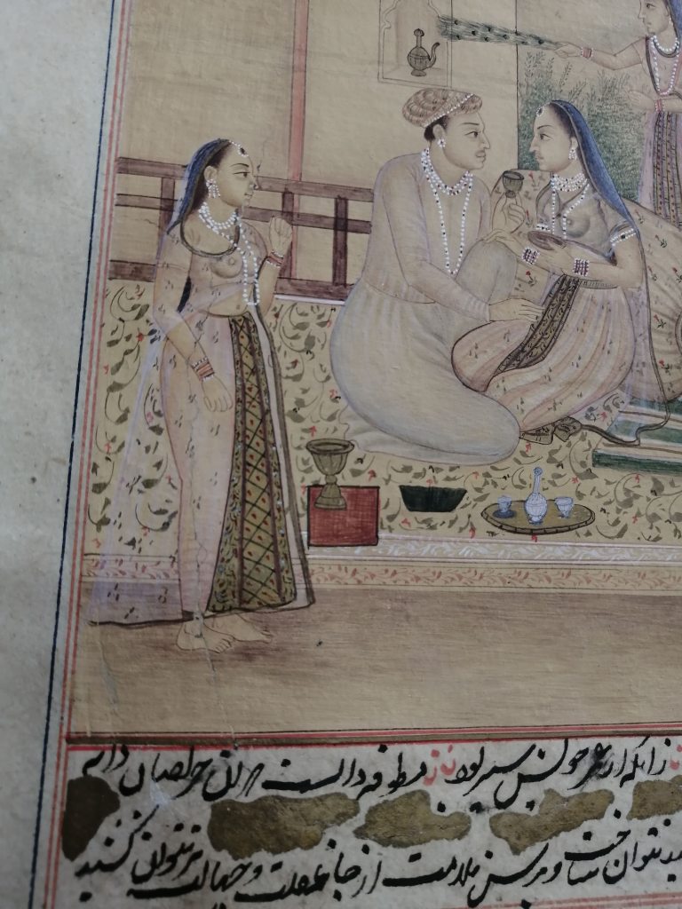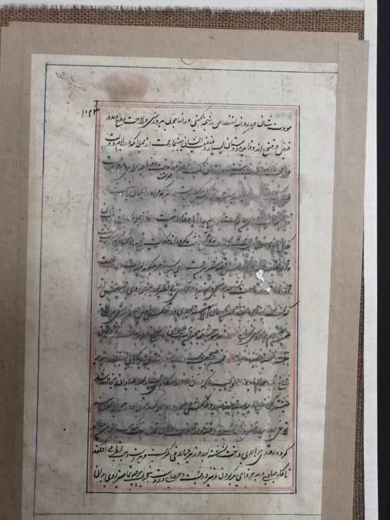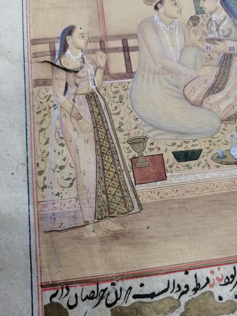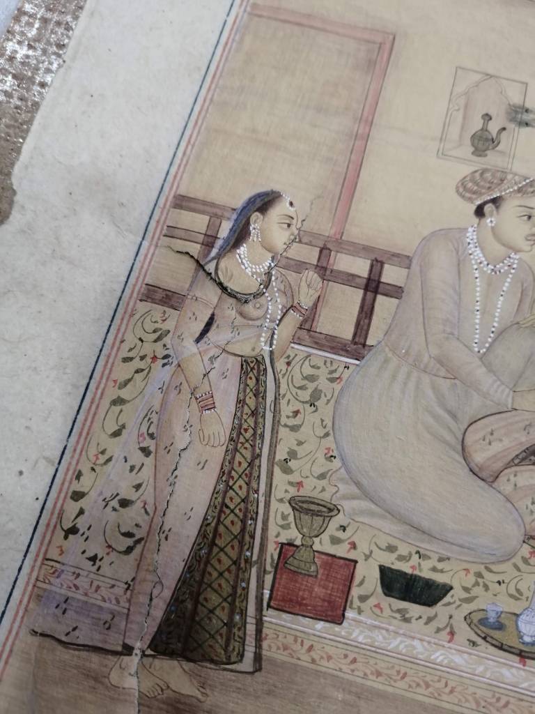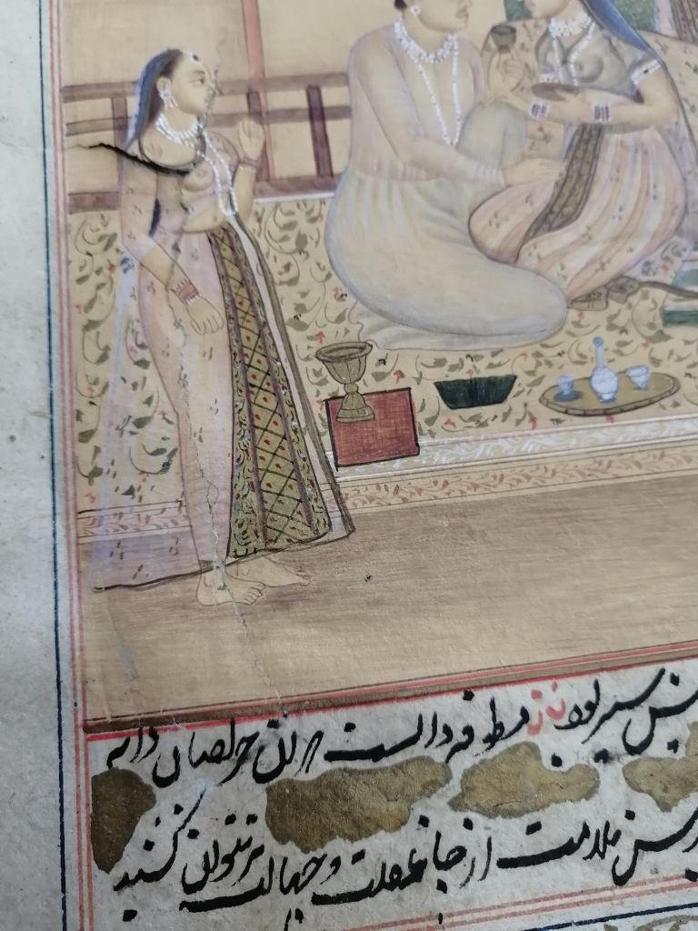 Conservation operations: After superficial cleaning with a soft goat hair brush, the tear was restored using Japanese paper fiber bridges, on the back of the page, using Klucel G in hydroalcoholic solution. Next, the page was flattened, interleaved with non-woven fabric, using controlled weights under a layer of felt.